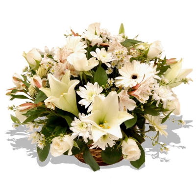Delicate white roses emit a gentle fragrance, while St. Joseph lilies unfurl their majestic trumpet-shaped blooms in this charming basket posy. Adorned with cheerful gerberas and intricate alstroemeria, this arrangement exudes an aura of elegance and tranquility, thanks to its exclusive display of white blossoms.